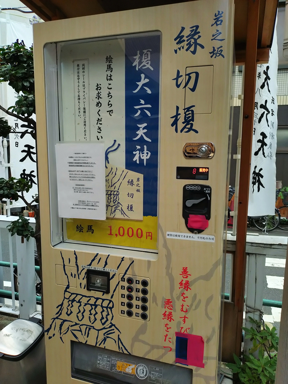 敷地内に設置されている自動販売機で絵馬を販売しています(根付とセットで1,000円)
