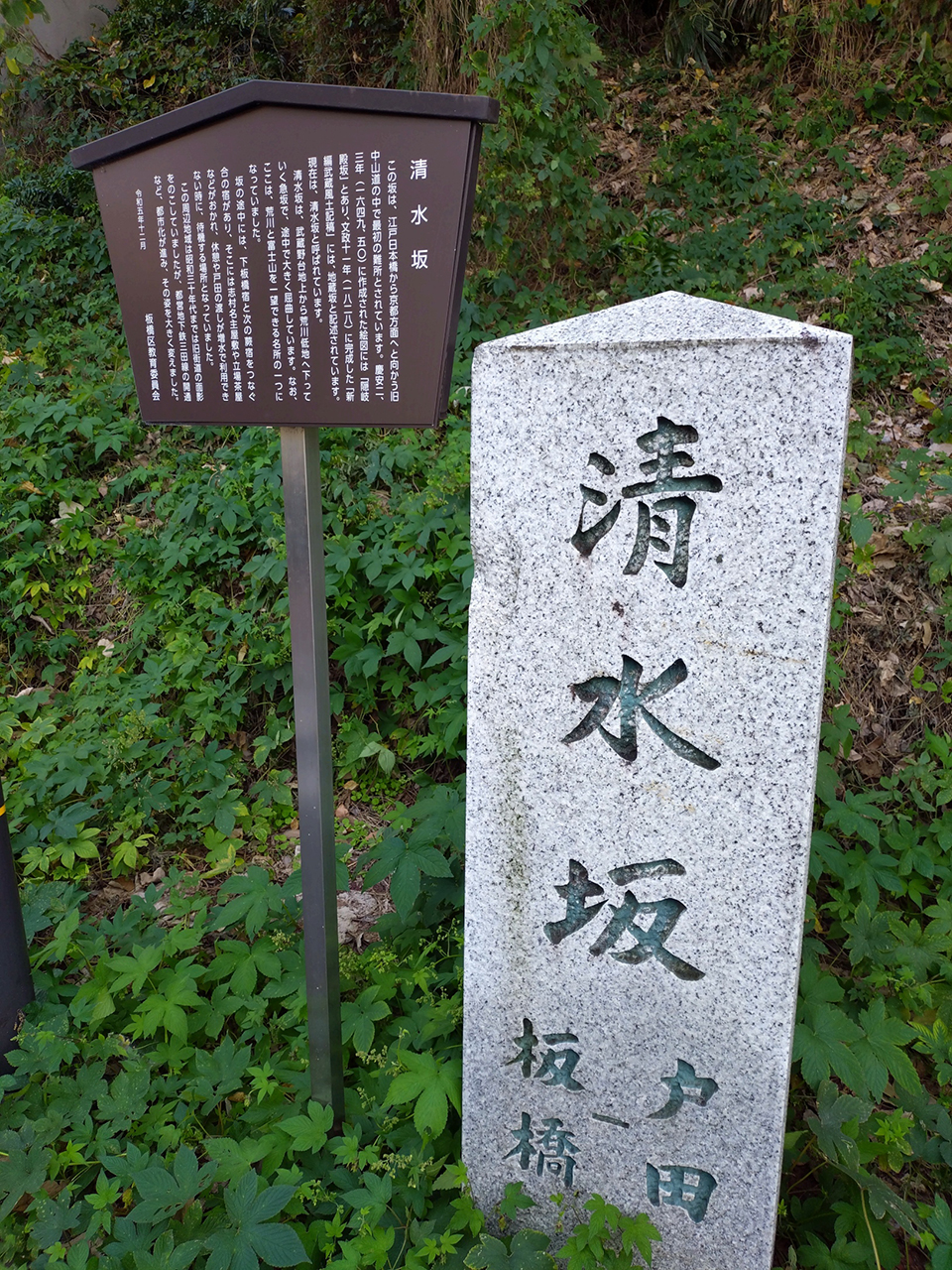 坂を下った右手にはかつて大善寺という寺院がありました。鷹狩りの折りにここで休憩した徳川八代将軍吉宗が、崖からの湧き水の見事さに寺の本尊の薬師如来を清水薬師と命名し、やがて坂も「清水坂」と呼ばれるようになったと伝えられています。