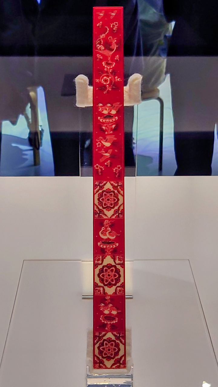 ・赤く染めた象牙に「撥鏤(ばちる)」という奈良時代に流行した表面を彫って文様を白く浮かび上がらせる技法を施して作られた儀式用のものさし