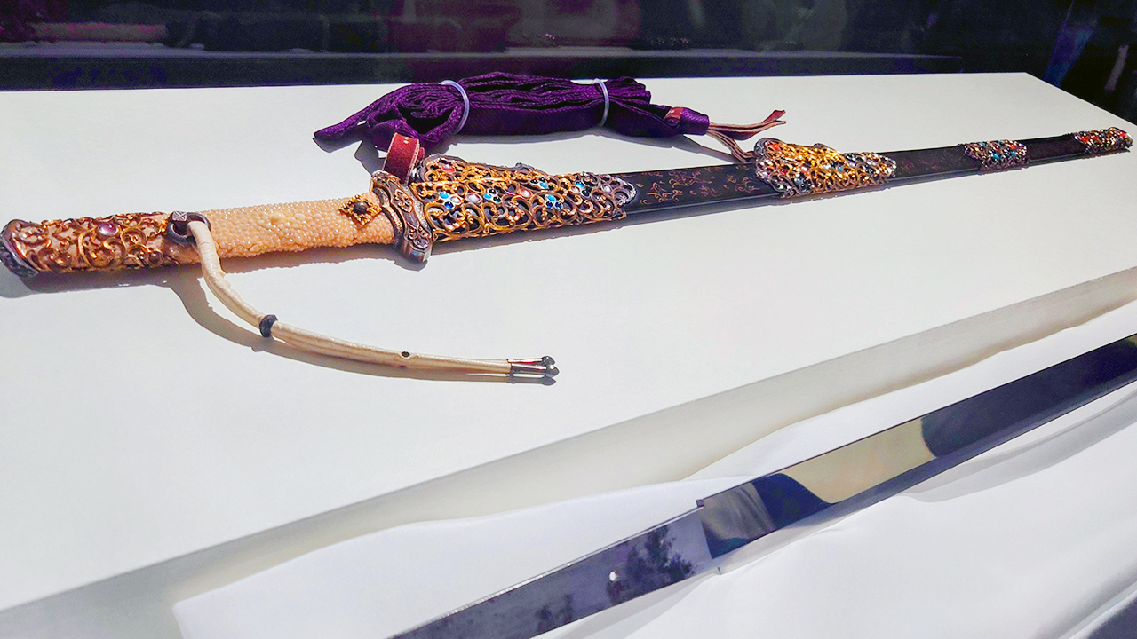 ・儀式用宝剣。黒漆に金蒔絵で鳥獣や花雲などが描かれ、唐文様が透彫りされた金具には水晶玉が飾られている